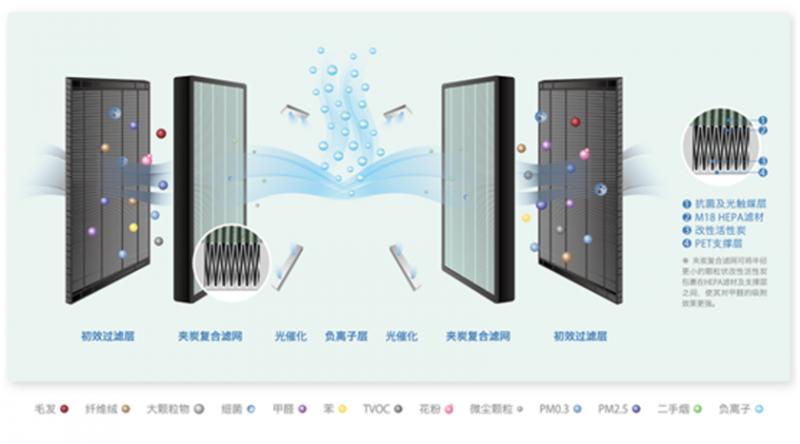 通過特殊工藝制成的改性活性炭,可將甲醛固化并吸附,其去除率可達普通活性炭的幾十倍。此外,為了提高活性炭的吸附力,purVAIR采用了夾炭復合濾網,將改性活性炭改造成體積為普通活性炭1/10的粉末狀顆粒,并包裹在HPEA濾網及PET支撐層中間,甲醛凈化CADR值也顯著提高。